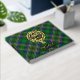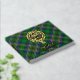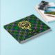 Clan Cockburn crest badge surrounded by a strap and buckle over tartan background. Custom front, back and spine text.