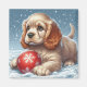 A charming cocker spaniel puppy lies on a snowy surface holding a festive red ball adorned with snowflakes.