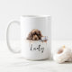 A morning coffee mug with a brown cocker spaniel with custom name in script style. "May your Coffe be stronger than your dog's Attitude" is written on the back. Perfect gift for dog owners that have a dog with an attitude and also love coffee.
