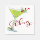 Modern Cheers typography Cocktail Holiday Christmas Party Paper Napkins featuring a green martini glass adorned with holly and a red & white stripe candy cane