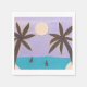 These cocktail napkins are designed with a mixed-medium depiction of silhouetted palms against a lavender sky over a turquoise ocean.