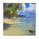 A bright, sunny and cheerful day on a lush green tropical coconut palm tree island! Blue sky and big puffy white clouds, calm and warm tropical sea water with a soft sandy beach.