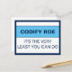 Codify Roe It's the Very Least You Can Do.Codifying Roe should be the floor of women's healthcare rights, not the ceiling. And now, even that doesn't exist. Tell Congress it's time that they do the very least they can do for women's health, safety, and equality, because women are people, and abortion, whatever the reason, is healthcare. Design description: The design space is a white background with a dark blue border. In the top half of the design space, the words, "Codify Roe" in a dark blue sans serif font. Underneath that, a wide light blue stripe with matching dark blue top and bottom borders. Below the stripe, in the bottom half of the design, the words, "It's the very least you can do" across two lines.