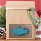 This product features a cartoon drawing of a blue, spotted coelacanth on a brown background.