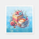 A pretty ai watercolor style piece of birthday cake with pink and blue flowers next to a cup of coffee or expresso.