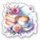 A pretty ai watercolor style piece of birthday cake with pink and purple flowers and roses next to a cup of coffee or expresso pretty floral birthday sticker.