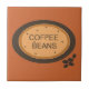 A cool design featuring a coffee beans sign in burnt orange and chocolate brown. A few scattered coffee beans beside it. A burnt ornage background sets it off.