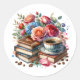 A really pretty ai watercolor illustration of a a stack of vintage books, a cup of tea or coffee and pretty flowers stickers or envelope seals.