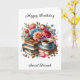A really pretty ai watercolor illustration of a a stack of vintage books, a cup of tea or coffee and pretty flowers personalised birthday card. YOu can change all the text on the card in the personalisation area. Pretty for any birthday for a friend or family.