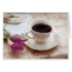 Cup filled with coffee sitting on a saucer with pink cala lilies and cloth napkins