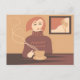 Illustration of a lady sitting at a table drinking a hot cup of coffee or tea.