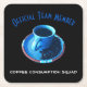 This humourous paper coaster is great for athletic supporters and coffee lovers. It features my digitally altered close-up photograph of a coffee filled blue cup and saucer with coffee beans over a black background. The arched blue text above the photograph reads "Official Team Member". The white text below the cup and saucer photograph reads "Coffee Consumption Squad". Fill in the template fields to change the text or click customise to select a typeface style, size, and colour you like.
