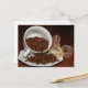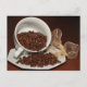 Send a hello with this photograph of a white coffee cup and saucer with coffee beans spilling out.