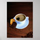 A "have a break" illustration with a white cup of coffee - the coffee with heart shape made of foam, 2 pieces of chocolate zwieback rusk and a few coffee beans on a wooden background.