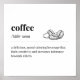 This poster features a funny definition of the word "coffee." Pictured above the definition, is a hand-drawn illustration of some coffee beans. Frame it, for a great addition to any coffee bar or kitchen! Also available in white on black.