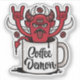A red three-eyed demon with horns and outstretched arms emerges energetically from a steaming mug labelled Coffee Demon. Coffee beans surround the creature adding to the playful quirky theme. The demon's hands are making the heavy metal devil horns hand gesture. Great gift for coffee lovers. Tags: devil, demon, coffee, evil, caffeine, latte, mocha, espresso, cappuccino, arabica, americano, roast, monster, mug, cup, horns, spooky, playful, beans, energy, quirky, devil horns, cartoon, cute, drip, stain