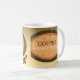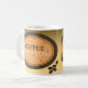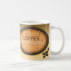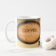 A modern coffee sign says 'coffee frappuccino' on an orange background with a brown border around it. A few loose coffee beans beside it. A shaded mocha background behind signs.