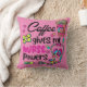 Colourful nurse design throw pillow features tie dye and cool colours stethoscope, bandages, pills, hearts, and a cup of coffee with text that reads Coffee Gives Me Nurse Powers!