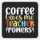 Funny coffee design for teachers who love and need their coffee on teacher bags, notebooks, mugs, pillows, T-shirts, buttons, and more. Text reads Coffee Givers Me Teacher Powers!