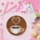 A Cup of coffee illustration featuring a white mug of hot coffee with heart shaped smoke on a brown background with typography on the wall.
