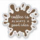 Add personality to your space with these high-quality custom-cut Coffee is Always a Good Idea stickers, perfect for decorating desks, laptops, journals, and more.