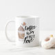 A cute and funny coffee themed mug design perfect for coffee lovers. Design features our hand-drawn kawaii style latte coffee-to-go cup illustration. Whimsical latte mug kawaii character with swirl and heats creating the latte foam. A sweet little simile and hands creating a heart shape. "Coffee is my First Love" in hand lettering, adds a fun and artist look. Personalise the coffee collar with a name. The reverse side of the mug features our cute little heart design with a name repeated. All illustrations are hand-drawn original artwork by Moodthology.