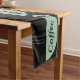 The quintessential table runner for the coffee lover! Features a big piping hot cup of coffee on a charcoal background. Neutral to compliment most decors.