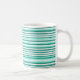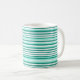 Coffee mug is shown in a teal and aqua colour striped print.