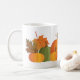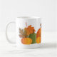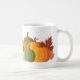 This ceramic coffee mug is shown in white with a lovely autumn pumpkins and leaves print.