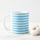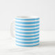 This ceramic coffee mug is shown in basic but stylish bright blue and white with stripes print.