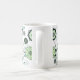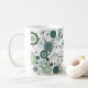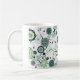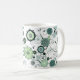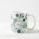 This ceramic coffee mug is shown with a pretty floral print design in colours of aqua and green's.