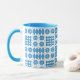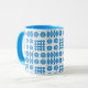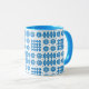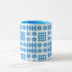 A chic white Coffee Mug, with a Bright Blue lip and handle and a pattern of traditional Welsh Tapestry motifs in Bright Blue on a White background. This pattern will fit all Mug sizes.