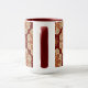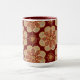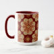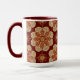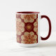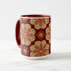 This decorative mug features a pattern gold Medallions on wine. The inside and handle of the cup is maroon. This pattern originates in an original tile design. The medllions and rich colours lend it a bohemian feel. The colours include ochre, and peach, on a wine background. Use this on your kitchen backsplash, bathroom or fireplace. It's perfect for your country cottage or farmhouse. This design comes from Oregon tile maker Fay Jones Day.