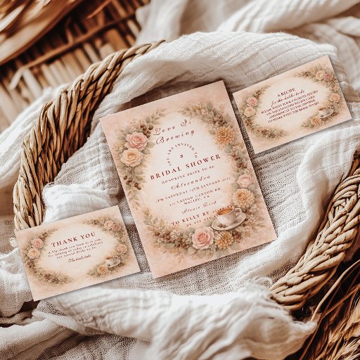 Warm, cozy, and beautifully romantic, this coffee-inspired bridal shower design blends soft blush roses, rich espresso tones, and delicate autumn botanicals over a vintage parchment background. A charming coffee cup detail and scattered beans create the perfect “Love Is Brewing” atmosphere for a brunch celebration, café gathering, or fall bridal shower. The elegant typography keeps the look refined while the warm earthy palette adds an inviting, intimate feel. A lovely choice for coffee lovers, fall brides, and cozy-chic celebrations.