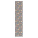 This fun table runner features a colourful boho style pattern that uses images of coffee pots, hearts, rainbows and flowers. The images are in tones of red, gold, and brown, and placed on a medium grey blue background.
