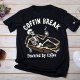 Take a break in style with this quirky t-shirt featuring a skeleton lounging in a coffin with a coffee cup, paired with the phrase "Coffin Break, Powered by Coffee." A perfect design for coffee lovers with a dark sense of humour.