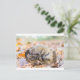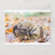 Coiled hedgehog lying on leaves in fall season postcard