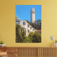 The image shows Coit Tower in San Francisco, California, rising above the surrounding buildings and trees. The tower is a light grey colour and stands tall against a clear blue sky. In the foreground, there are residential buildings with a mix of architectural styles, including a building with a rounded, blue-trimmed facade and a modern building with a series of balconies.