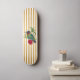 Skateboard deck with colibri and vertical gold stripes illustration.