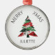 Features a collage Christmas tree in a colour palette of red and green. Personalise with a name.