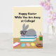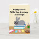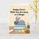 This greeting card shows a gray, humanlike bunny with long ears lounging across a tidy stack of three books, its curious eyes peering through dark-framed glasses as if studying while still thinking of someone special 🐰. The background is a soft pale yellow, giving the scene a sunny spring feel, and the bunny’s relaxed pose reads like a quiet, friendly check-in from afar. Across the top, a line of black greeting text is centered and easy to spot, with the message aimed at someone away at school. Near the books sits a slim phone in a bright pink case, suggesting a sweet, ongoing connection even when distance gets in the way. In the foreground, three striped egg-shaped decorations in blue, pink, and yellow add festive color, like little reminders saved for the person on the other end of the call 🌷. To the right, a clear glass drink with a dark straw and a green label stands beside a chocolate-coated treat covered in multicolored sprinkles. The overall look is flat and softly shaded, with the blue and teal book spines grounding the center while the pink phone and striped eggs pull your eye across the lower half. A pale yellow field frames the centered black headline above the bunny, with the books, pink phone, striped eggs, drink, and sprinkled treat arranged neatly along the bottom.