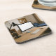 This coaster features a computer and desk. The image contains a college student's room with a map, bookshelf, bulletin board, bed, window, desk lamp, computer monitor, keyboard and mouse. The image is a digital photo style picture. The coaster is a plastic coaster with a non-skid cork backing. There are six plastic coasters in the set.