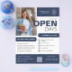 Invite future students and families to explore your campus with this professionally designed Open Day flyer. Perfect for colleges, universities, or educational institutions, this template highlights key event details like date, time, location, and featured activities—such as campus tours, info sessions, and meet-and-greets with faculty. With bold headings, modern icons, and a clear call to action, it’s an ideal way to promote your admissions event, both online and in print. Easily customisable to fit your school's branding and event schedule.