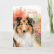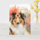 This birthday card is perfect for the dog mom, dog dad, or dog lover of the Rough Collie dog breed, featuring a colorful garden path in full bloom with bold orange, yellow, green and hues of Mother Nature.