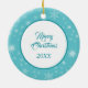 On the front of this Holiday ornament is a beautiful portrait of a Collie dog peeking out of a holly and evergreen bough. Red berries and pine cones decorate the holly and pine sprigs.The image is placed on a white circle framed by a retro blue snowflake pattern. The back of the ornament has the same background and circle with your custom text in blue on a white background.