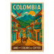 Foreground: a colonial street scene of Cartagena with vibrant pastel-coloured houses, balconies overflowing with tropical flowers, and cobblestone roads.