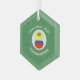 Christmas decor hexagon shaped glass ornament featuring a great haired angel, to honor Abuela, wearing the yellow, blue, and red flag of Colombia. The Colombian angel abuela flies in a white circle of squiggly squares on a green background of squiggly squares. Personalize for Christmas with a name, customize with the year. Or, add your own text.