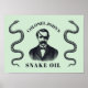 This vintage style medical print features a man wearing an eyepatch and two snakes. It reads, “Colonel John’s Snake Oil”.