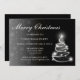 Christmas invitation in landscape orientation with color faded to blend in with solid black background. White sparkle Christmas tree decoration added.