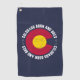 Show your Colorado pride with this golf towel that resembles the Colorado state flag. Has the words "Colorado Born and Bred" around the red and yellow centre. Set against a blue background. Makes a great gift for a Colorado native! Design has a distressed finish.